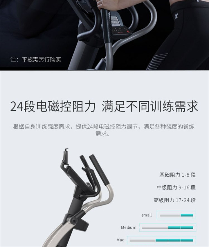 舒华家用椭圆机SH-B6500E采用电磁控系统,设有24段阻力等级,手握心律片侦测心率,7kg磁控轮。